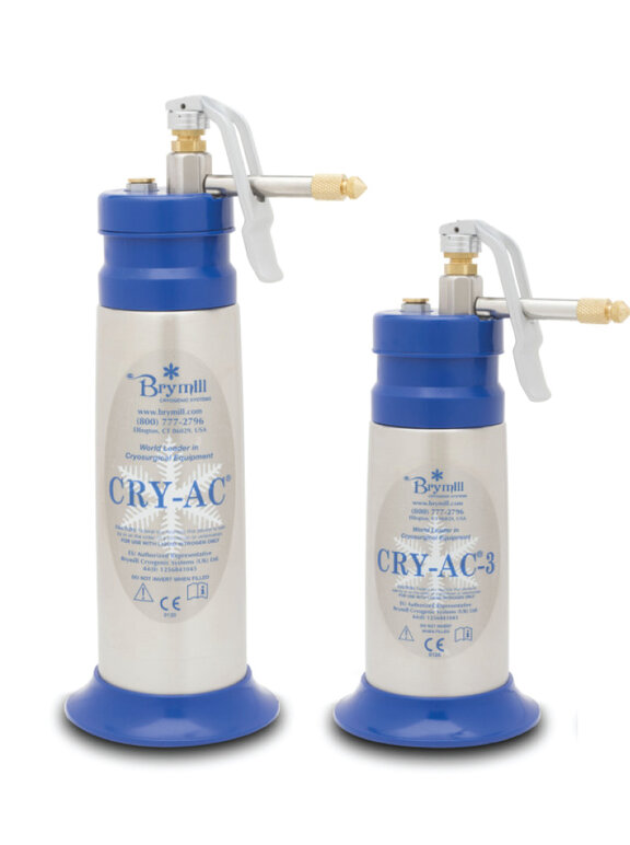 Le pistolet de cryothérapie Brymill Cry-Ac est un accessoire populaire dans les cliniques dermatologiques et vétérinaires, ainsi que chez les médecins. Il est utilisé pour délivrer un spray concentré d'azote liquide pour la cryochirurgie et les traitements de la peau.